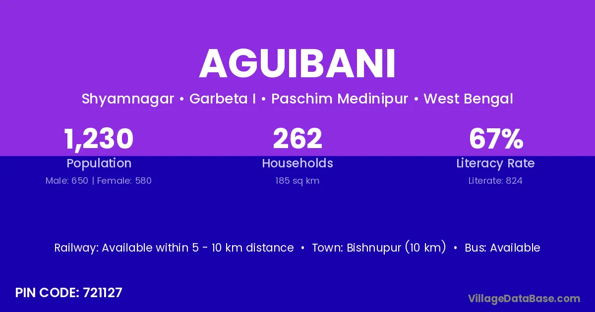 Aguibani village is located in the Garbeta I Subdivision of the Paschim Medinipur district in West Bengal.