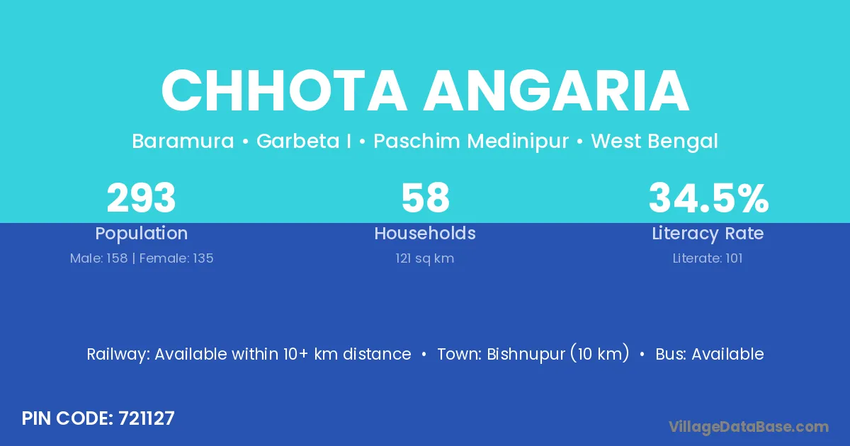 Bishnupur (10 km) is the nearest town to Chhota Angaria village for major economic activities and is located approximately 10 km away.