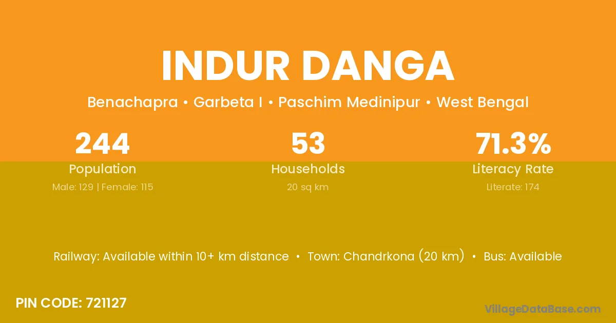 Chandrkona (20 km) is the nearest town to Indur Danga village for major economic activities and is located approximately 20 km away.