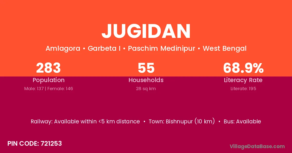 Bishnupur (10 km) is the nearest town to Jugidan village for major economic activities and is located approximately 10 km away.