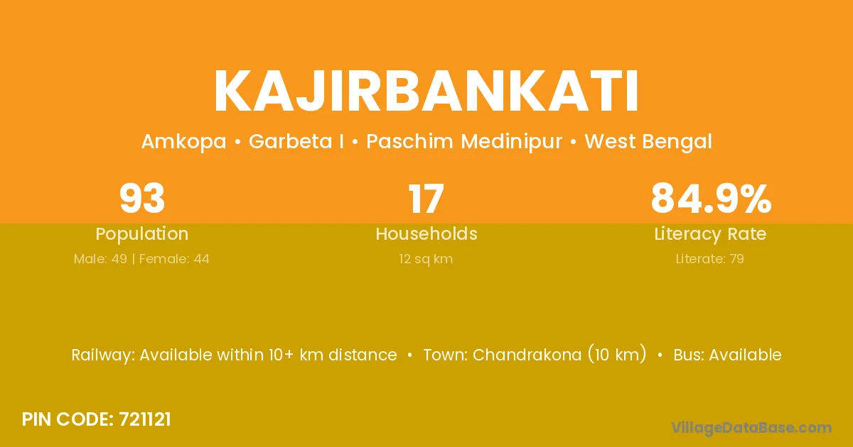 Chandrakona (10 km) is the nearest town to Kajirbankati village for major economic activities and is located approximately 10 km away.