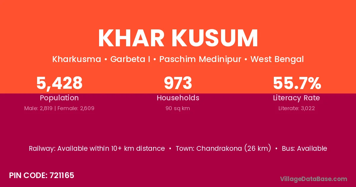 Chandrakona (26 km) is the nearest town to Khar Kusum village for major economic activities and is located approximately 26 km away.