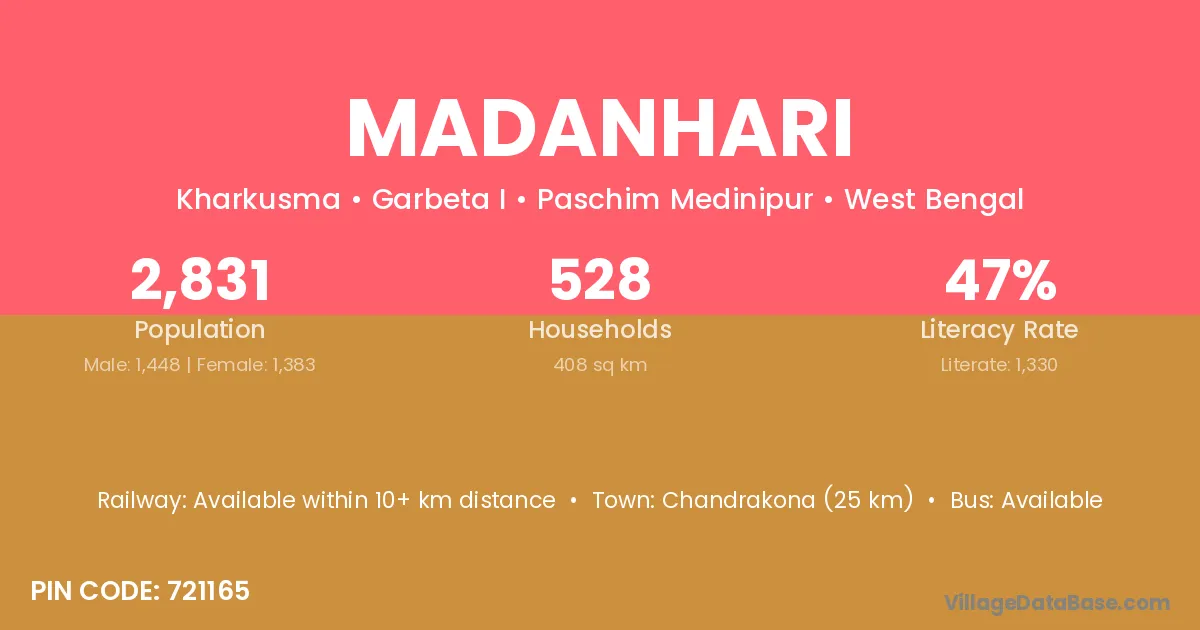 Chandrakona (25 km) is the nearest town to Madanhari village for major economic activities and is located approximately 25 km away.