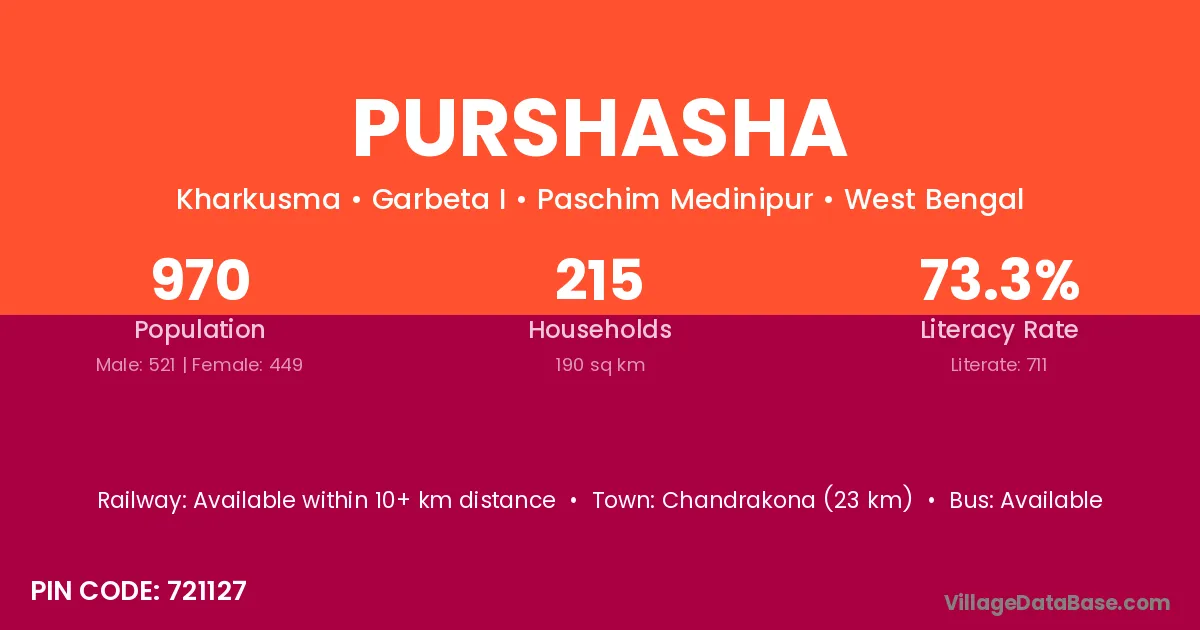 Chandrakona (23 km) is the nearest town to Purshasha village for major economic activities and is located approximately 23 km away.