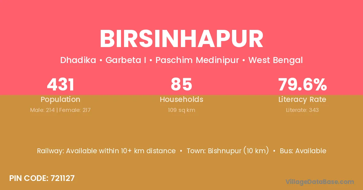 Bishnupur (10 km) is the nearest town to Birsinhapur village for major economic activities and is located approximately 10 km away.