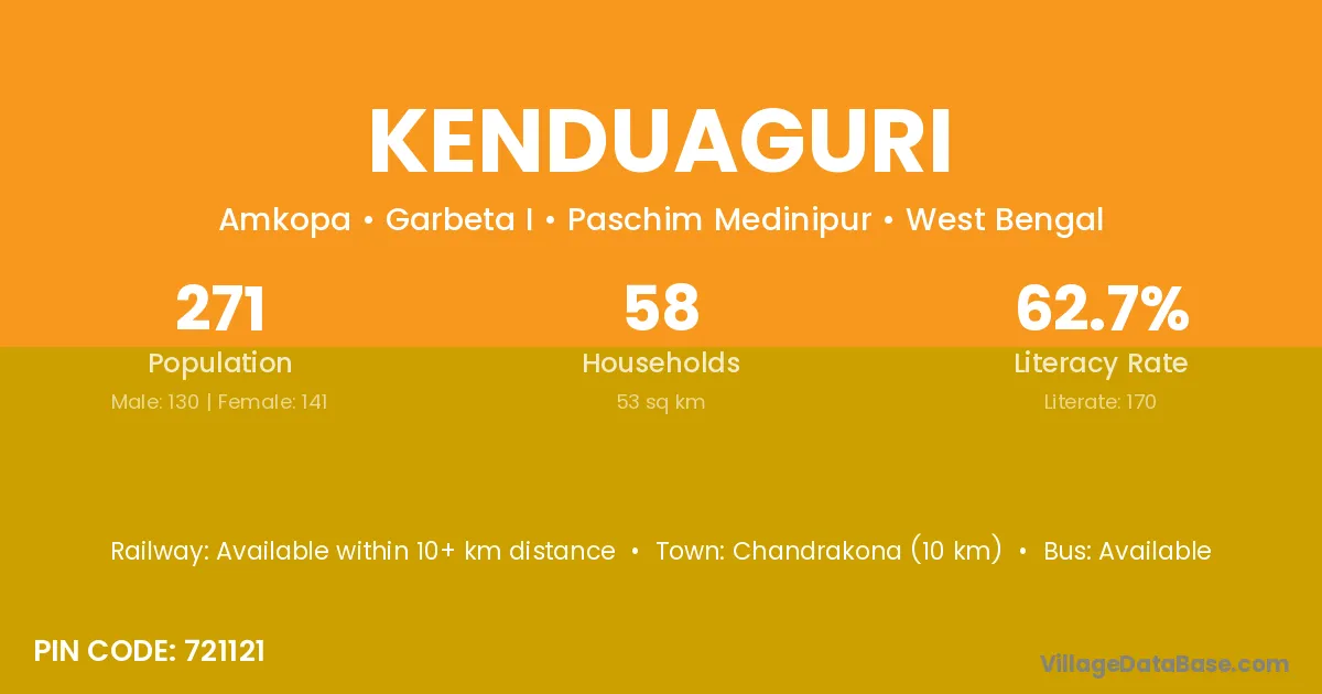 Chandrakona (10 km) is the nearest town to Kenduaguri village for major economic activities and is located approximately 10 km away.