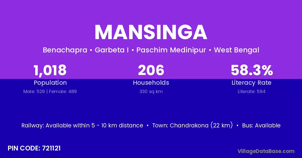 Chandrakona (22 km) is the nearest town to Mansinga village for major economic activities and is located approximately 22 km away.