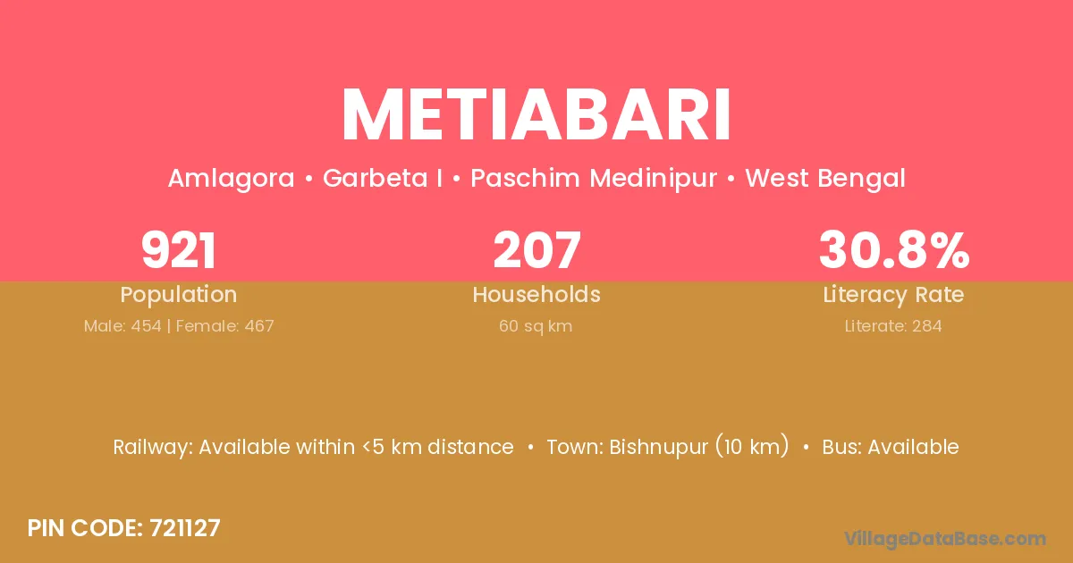 According to Census 2011 information, the village code of Metiabari village is 721127.