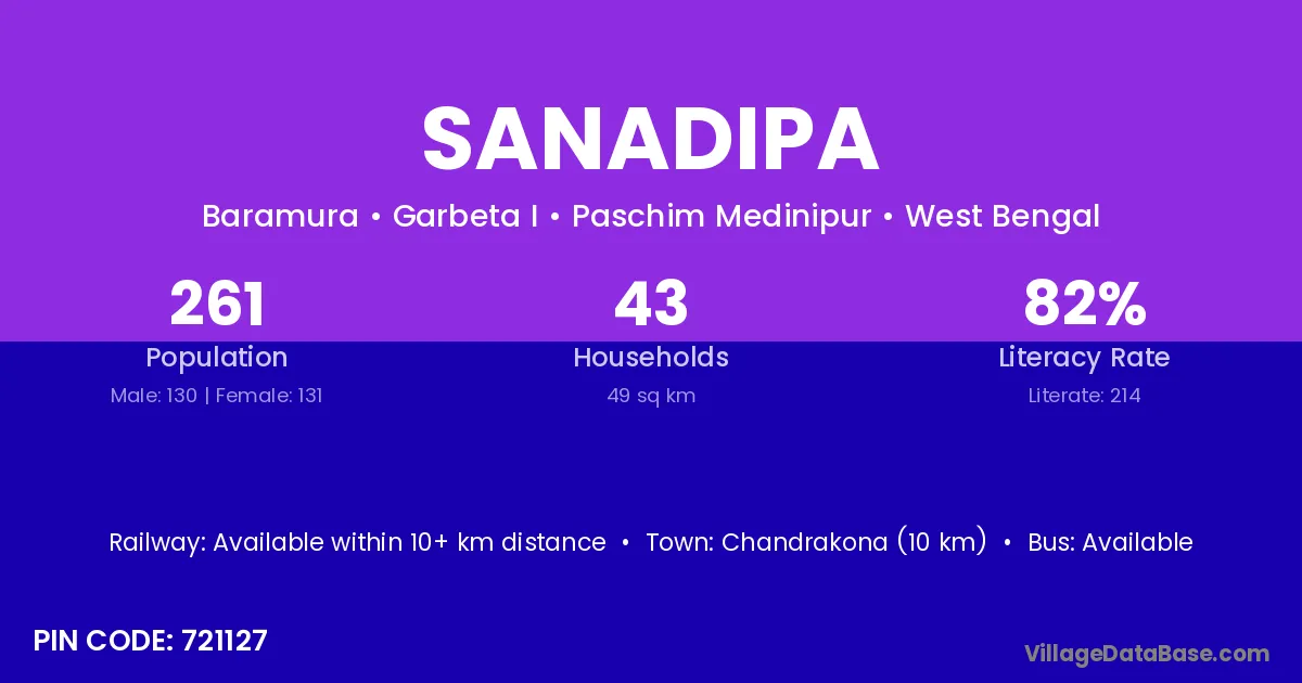 Chandrakona (10 km) is the nearest town to Sanadipa village for major economic activities and is located approximately 10 km away.