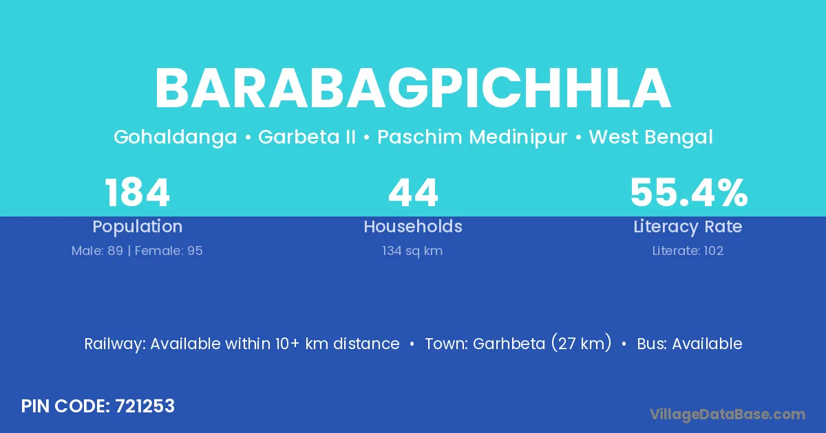 Garhbeta (27 km) is the nearest town to Barabagpichhla village for major economic activities and is located approximately 27 km away.