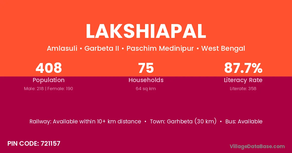 Garhbeta (30 km) is the nearest town to Lakshiapal village for major economic activities and is located approximately 30 km away.