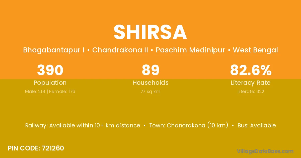 Garhbeta (22 km) is the nearest town to Shirsa village for major economic activities and is located approximately 22 km away.