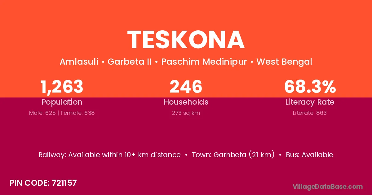 Garhbeta (21 km) is the nearest town to Teskona village for major economic activities and is located approximately 21 km away.