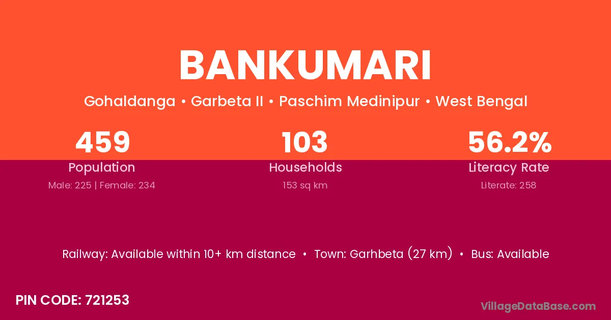 Garhbeta (27 km) is the nearest town to Bankumari village for major economic activities and is located approximately 27 km away.