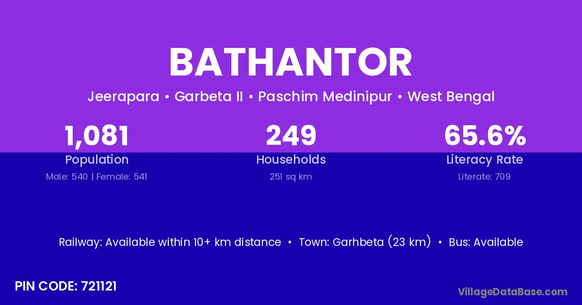 According to Census 2011 information, the village code of Bathantor village is 721121.