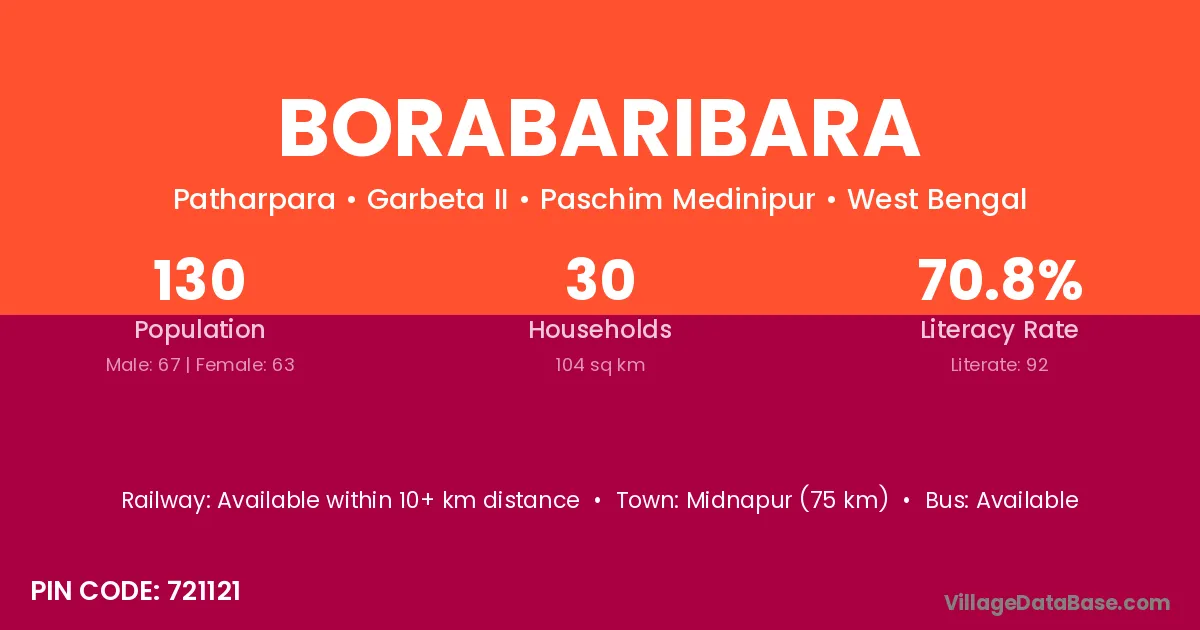 Midnapur (75 km) is the nearest town to Borabaribara village for major economic activities and is located approximately 75 km away.