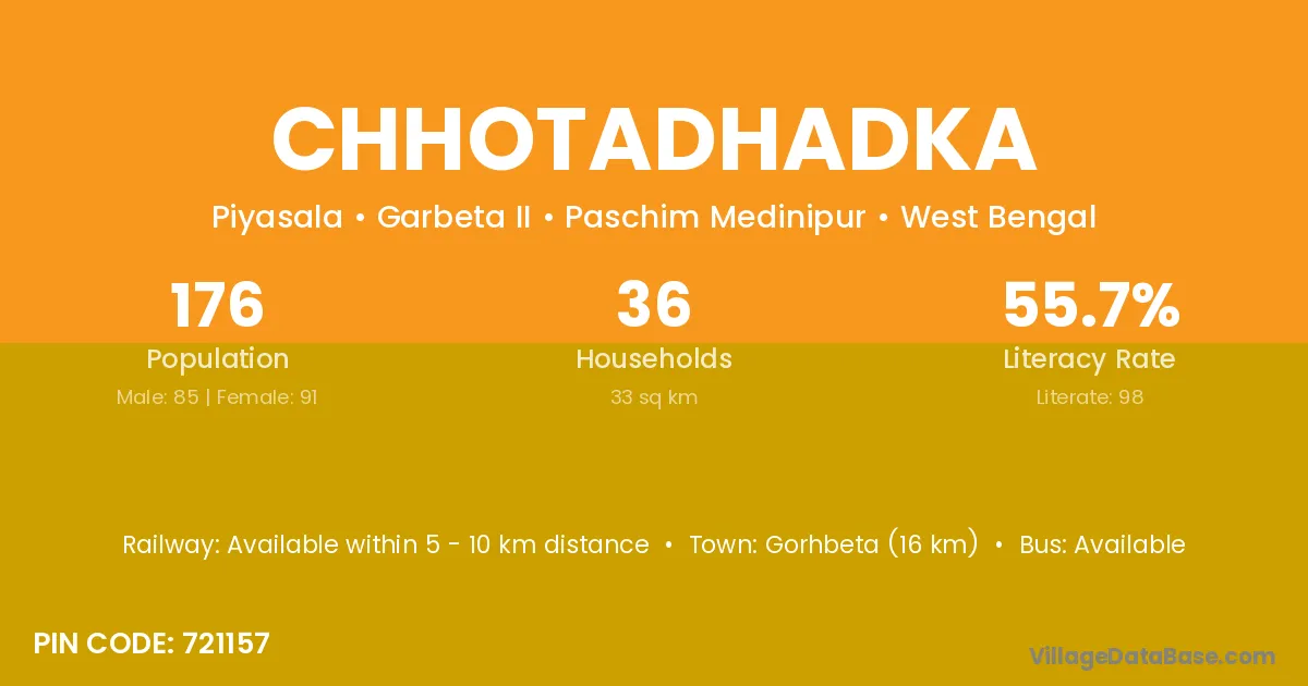 According to Census 2011 information, the village code of Chhotadhadka village is 721157.