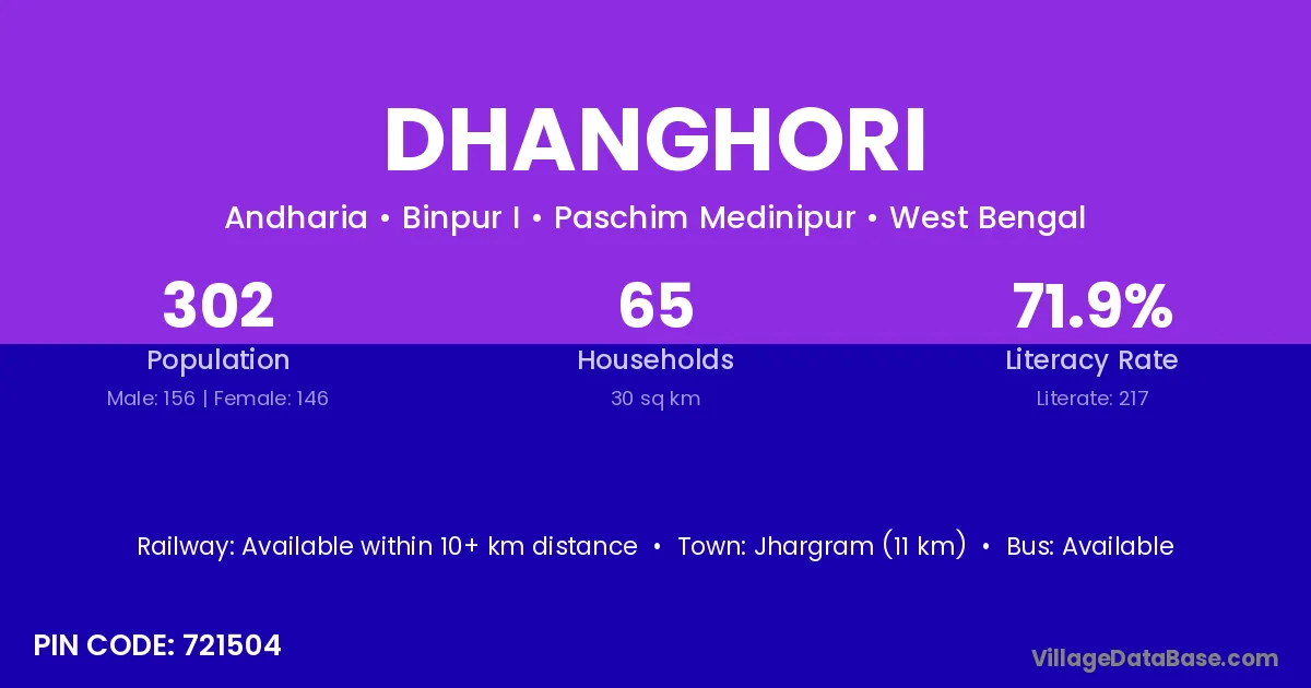 Garhbeta (27 km) is the nearest town to Dhanghori village for major economic activities and is located approximately 27 km away.