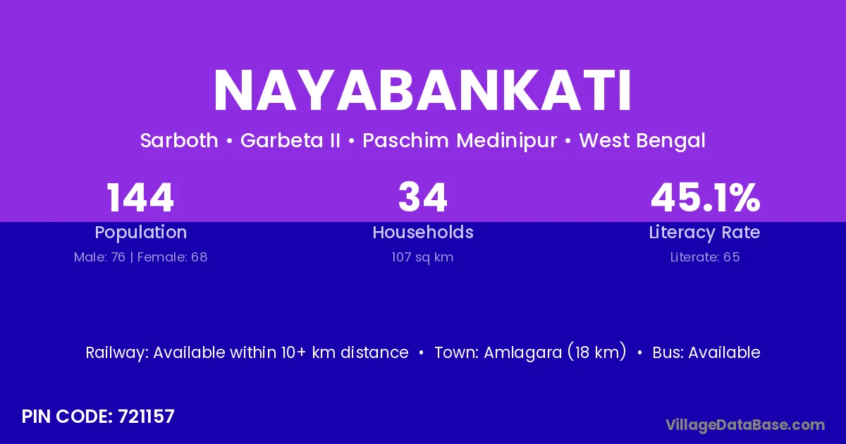 Amlagara (18 km) is the nearest town to Nayabankati village for major economic activities and is located approximately 18 km away.
