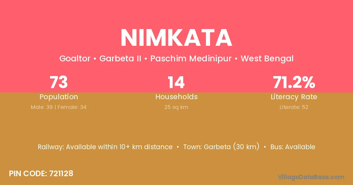 Garbeta (30 km) is the nearest town to Nimkata village for major economic activities and is located approximately 30 km away.