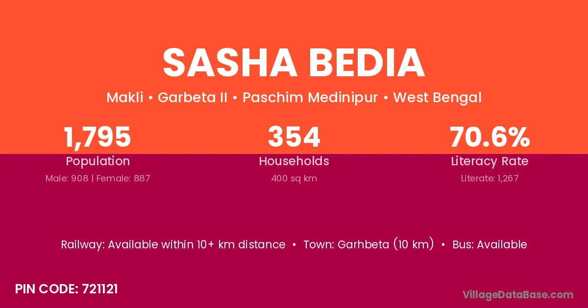 Garhbeta (10 km) is the nearest town to Sasha Bedia village for major economic activities and is located approximately 10 km away.