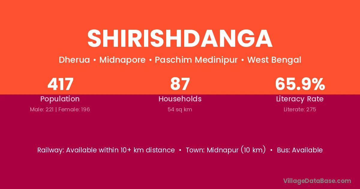 Shirishdanga village is located in the Garbeta II Subdivision of the Paschim Medinipur district in West Bengal.