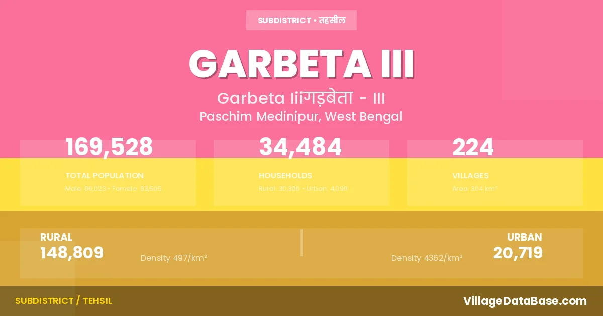 According to the 2011 census The total area of Garbeta III Subdivision is 304 km², with a population of 169528 people. The population density is 557 inhabitants per square kilometre, and there are approximately 34484 houses in the sub district.