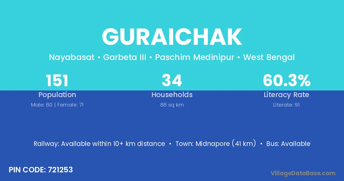 Midnapore (41 km) is the nearest town to Guraichak village for major economic activities and is located approximately 41 km away.