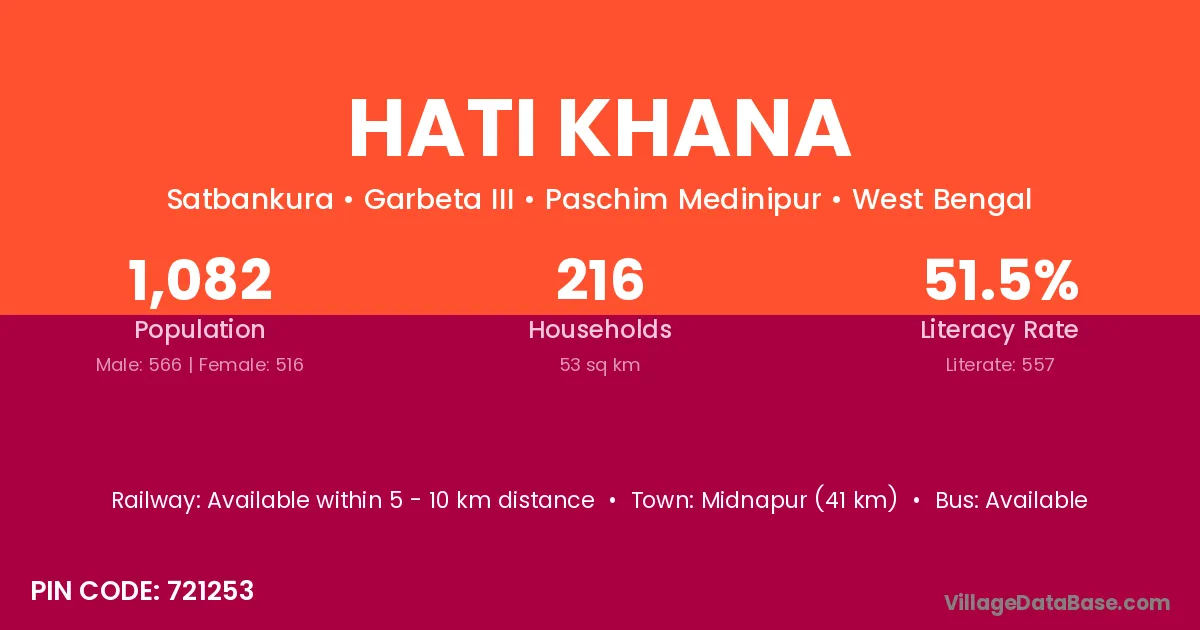 Midnapur (41 km) is the nearest town to Hati Khana village for major economic activities and is located approximately 41 km away.