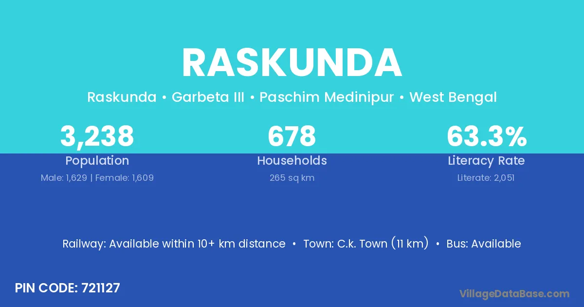 C.k. Town (11 km) is the nearest town to Raskunda village for major economic activities and is located approximately 11 km away.