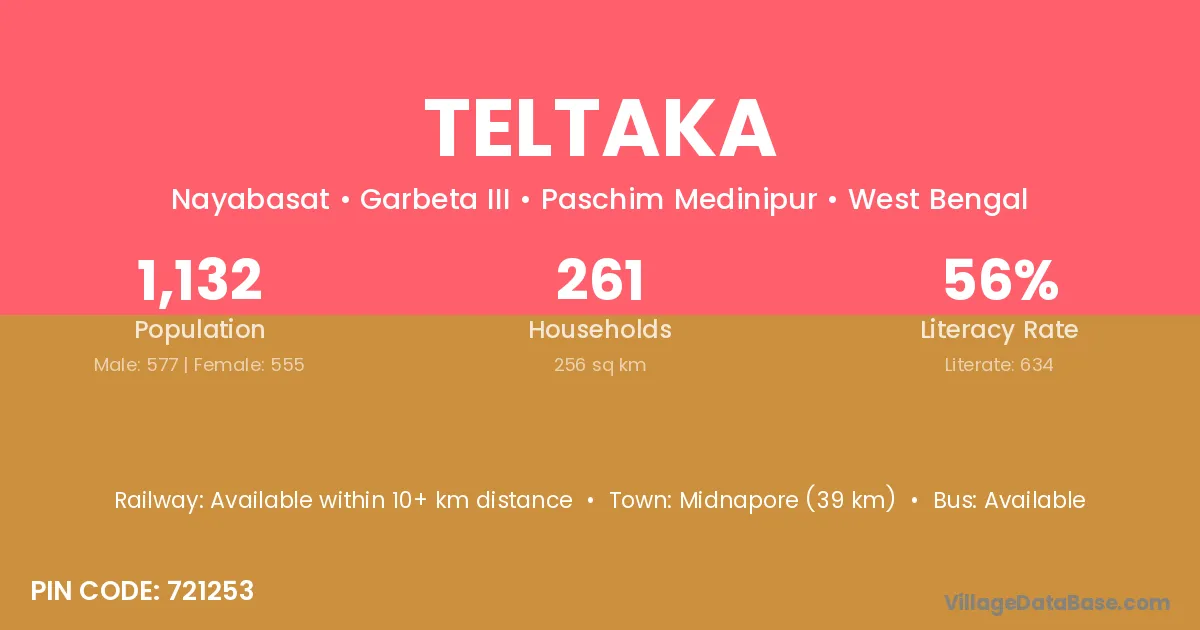 Midnapore (39 km) is the nearest town to Teltaka village for major economic activities and is located approximately 39 km away.
