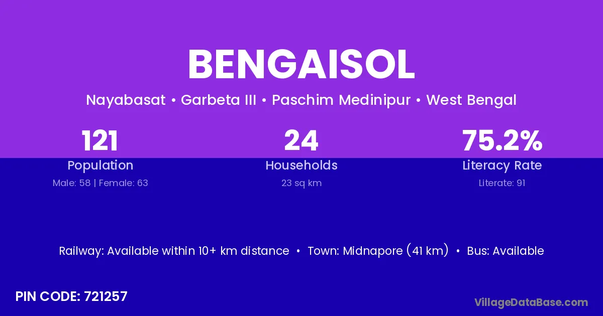 Midnapore (41 km) is the nearest town to Bengaisol village for major economic activities and is located approximately 41 km away.