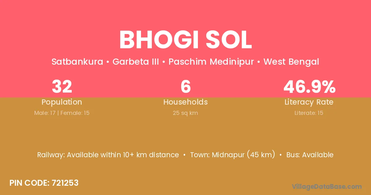 Midnapur (45 km) is the nearest town to Bhogi Sol village for major economic activities and is located approximately 45 km away.