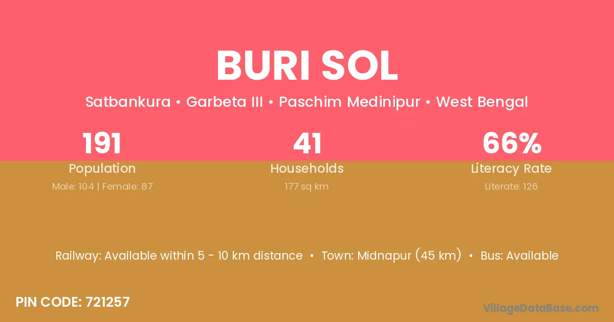 Midnapur (45 km) is the nearest town to Buri Sol village for major economic activities and is located approximately 45 km away.