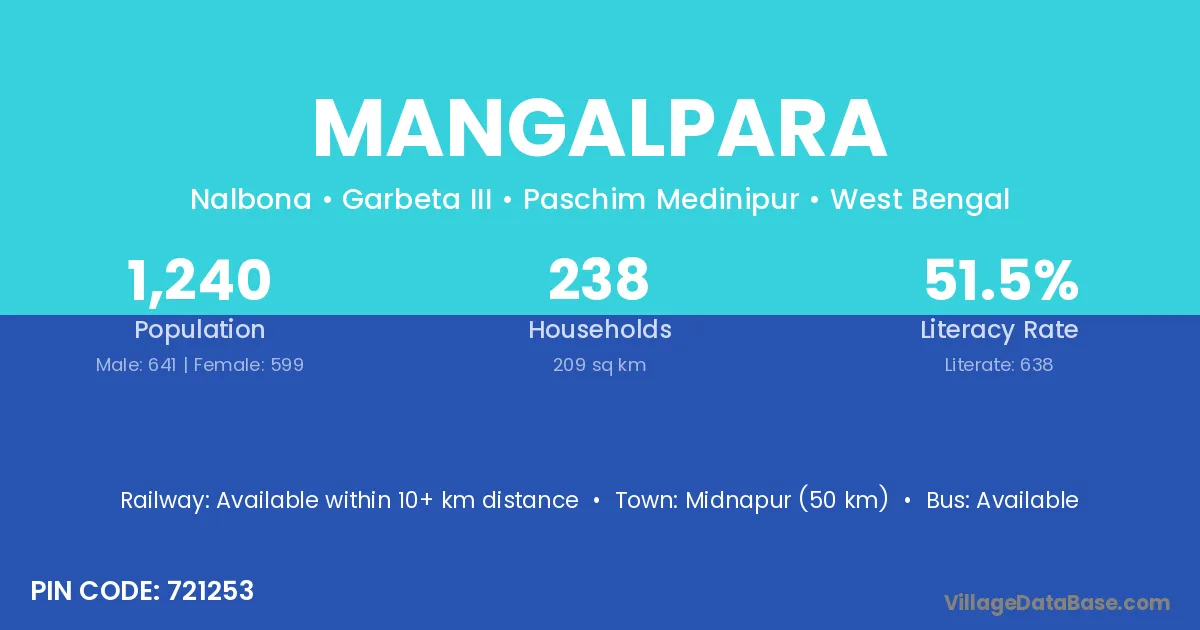 Midnapur (50 km) is the nearest town to Mangalpara village for major economic activities and is located approximately 50 km away.