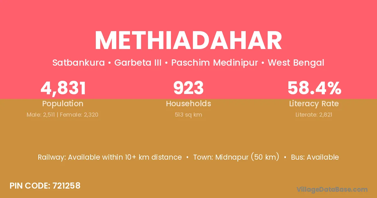Midnapur (50 km) is the nearest town to Methiadahar village for major economic activities and is located approximately 50 km away.