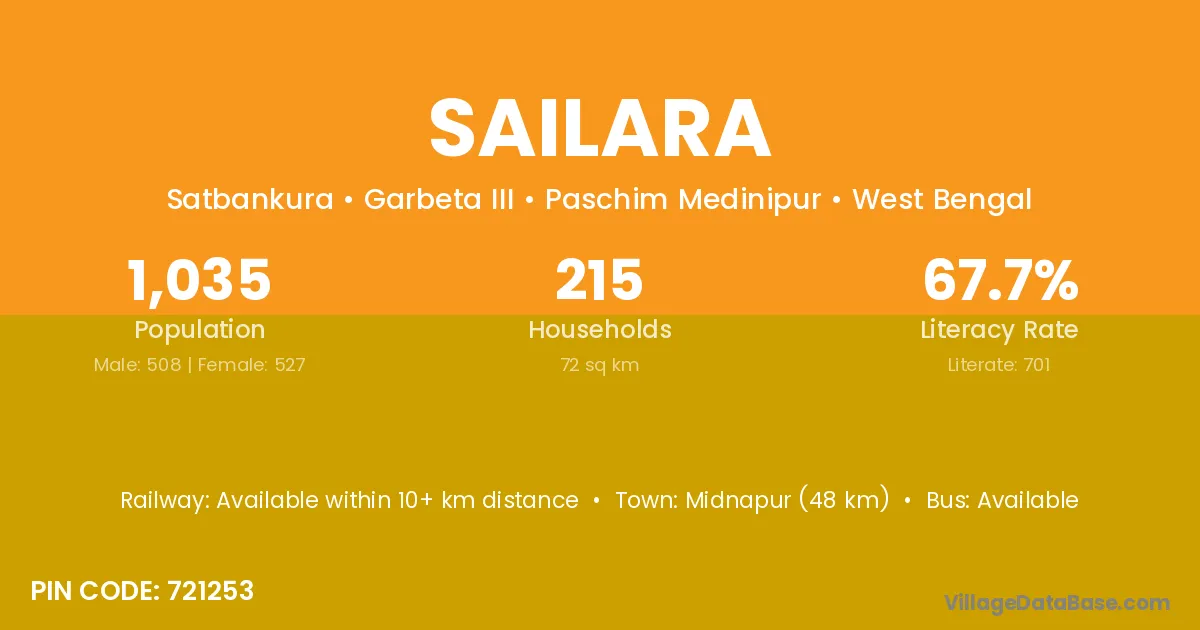Midnapur (48 km) is the nearest town to Sailara village for major economic activities and is located approximately 48 km away.