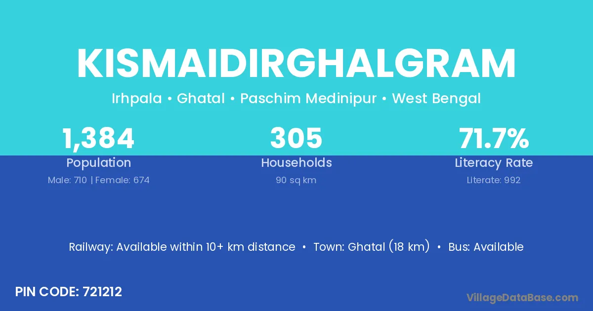 Ghatal (18 km) is the nearest town to Kismaidirghalgram village for major economic activities and is located approximately 18 km away.