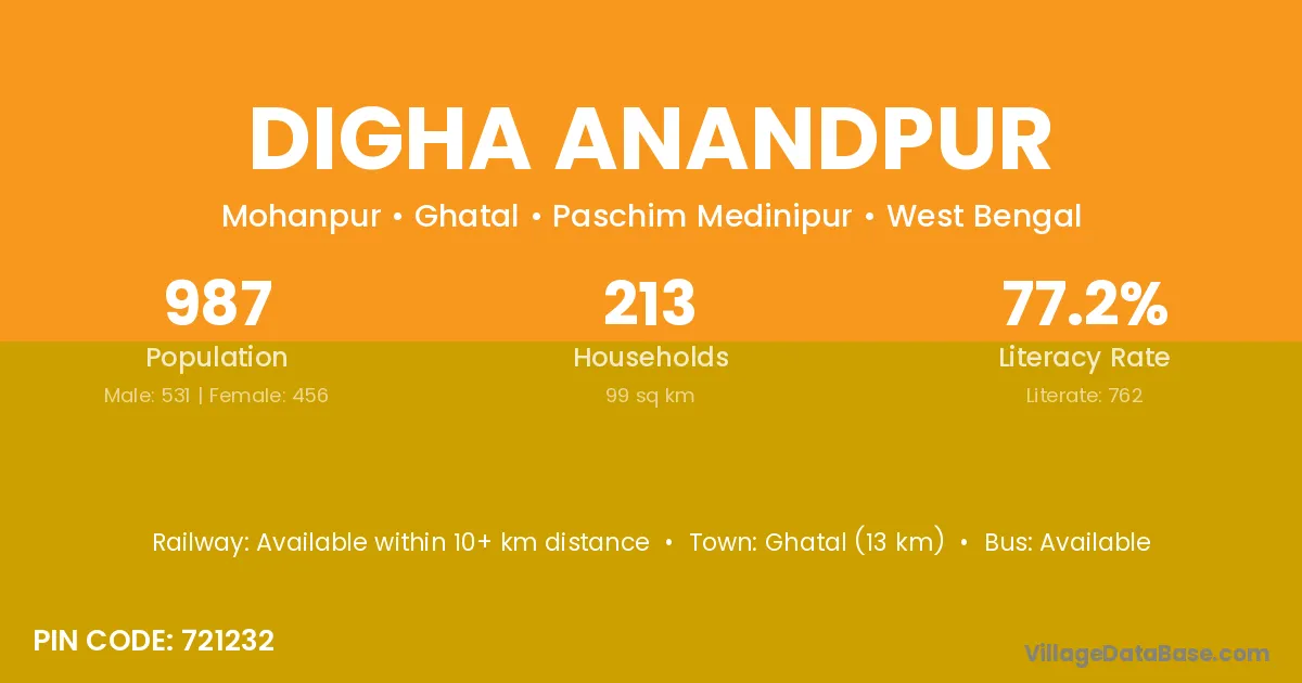 Ghatal (13 km) is the nearest town to Digha Anandpur village for major economic activities and is located approximately 13 km away.