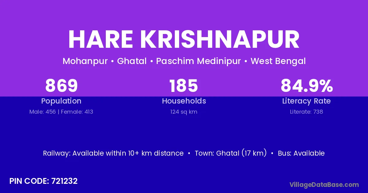 Ghatal (17 km) is the nearest town to Hare Krishnapur village for major economic activities and is located approximately 17 km away.