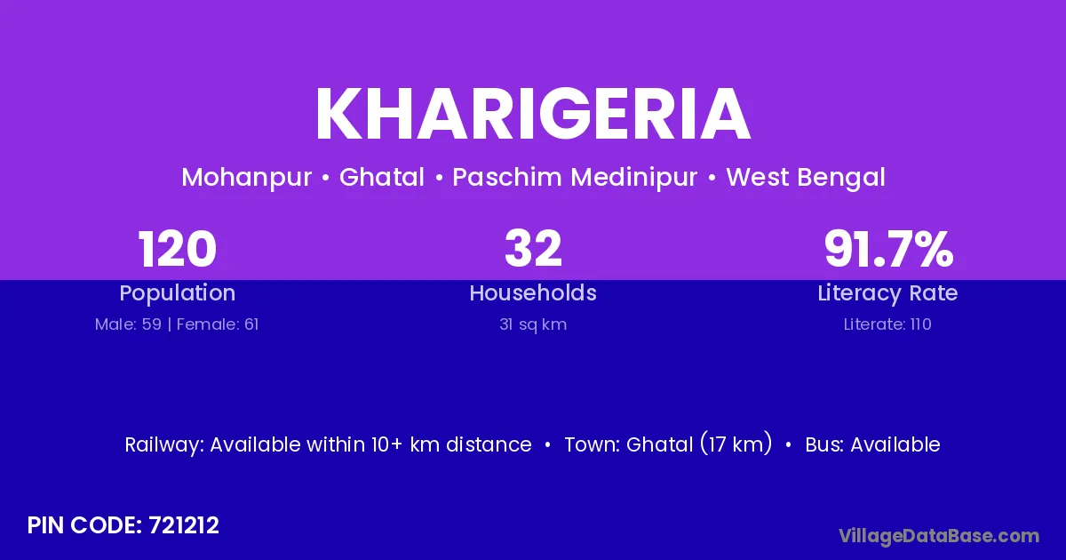 Ghatal (17 km) is the nearest town to Kharigeria village for major economic activities and is located approximately 17 km away.
