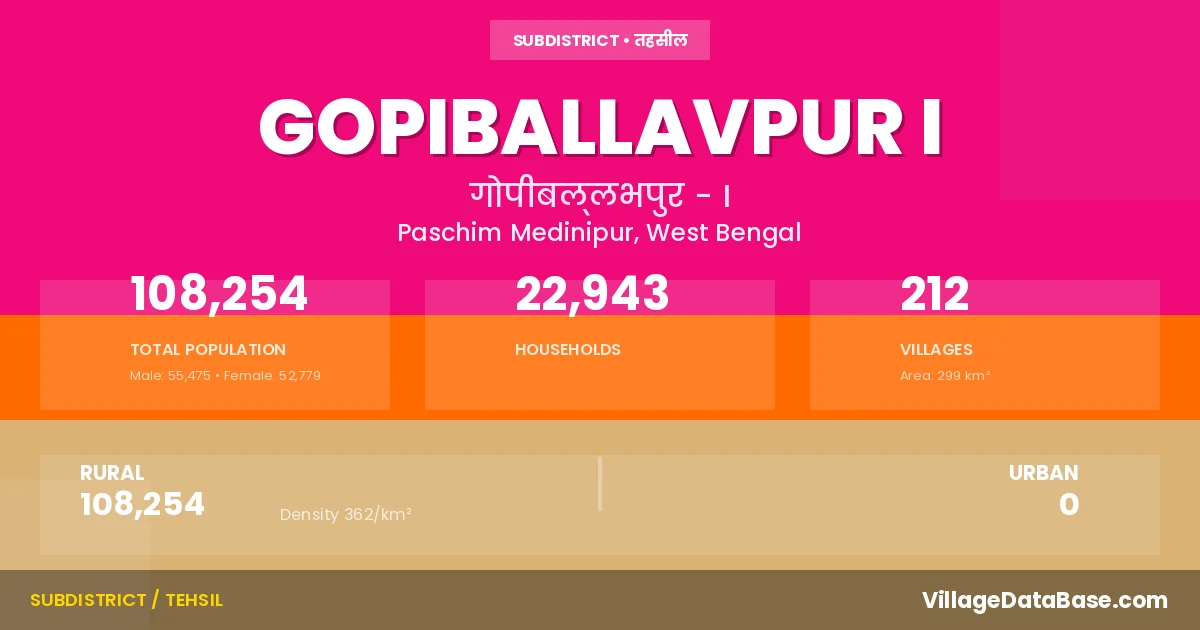 According to the 2011 census The total area of Gopiballavpur I Subdivision is 299 km², with a population of 108254 people. The population density is 362 inhabitants per square kilometre, and there are approximately 22943 houses in the sub district.