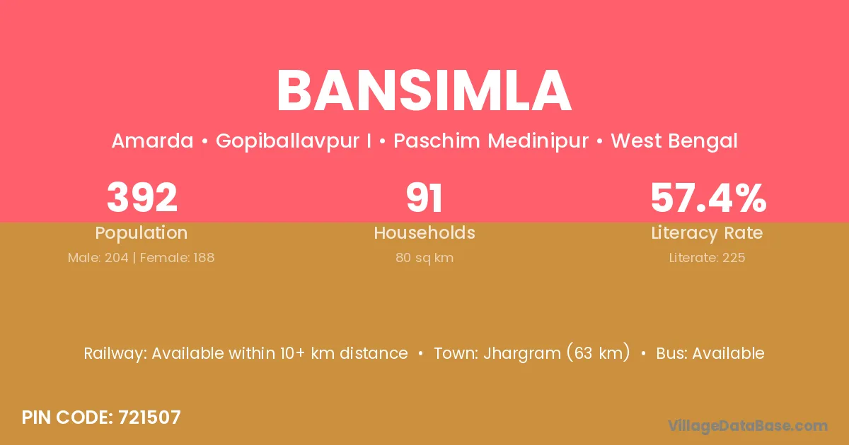 Jhargram (63 km) is the nearest town to Bansimla village for major economic activities and is located approximately 63 km away.