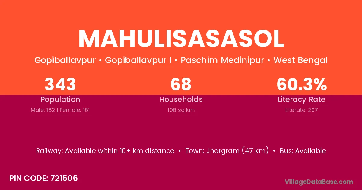 Jhargram (47 km) is the nearest town to Mahulisasasol village for major economic activities and is located approximately 47 km away.