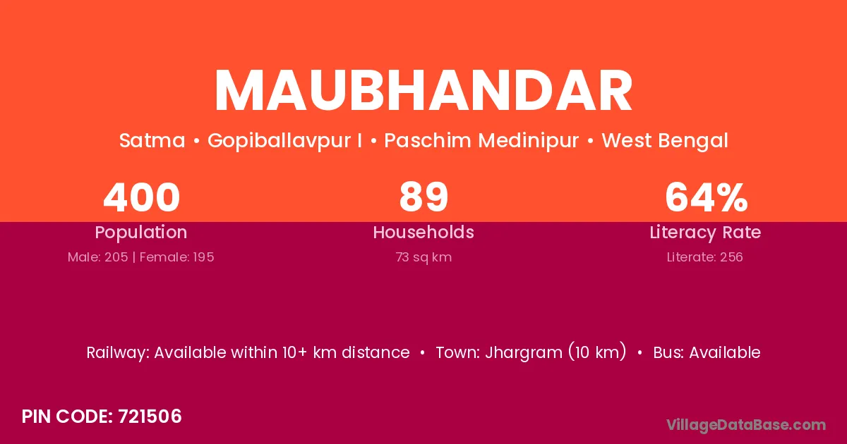 Jhargram (10 km) is the nearest town to Maubhandar village for major economic activities and is located approximately 10 km away.