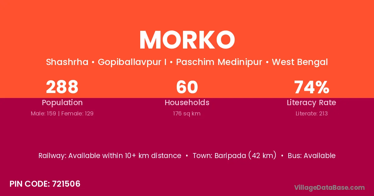Baripada (42 km) is the nearest town to Morko village for major economic activities and is located approximately 42 km away.