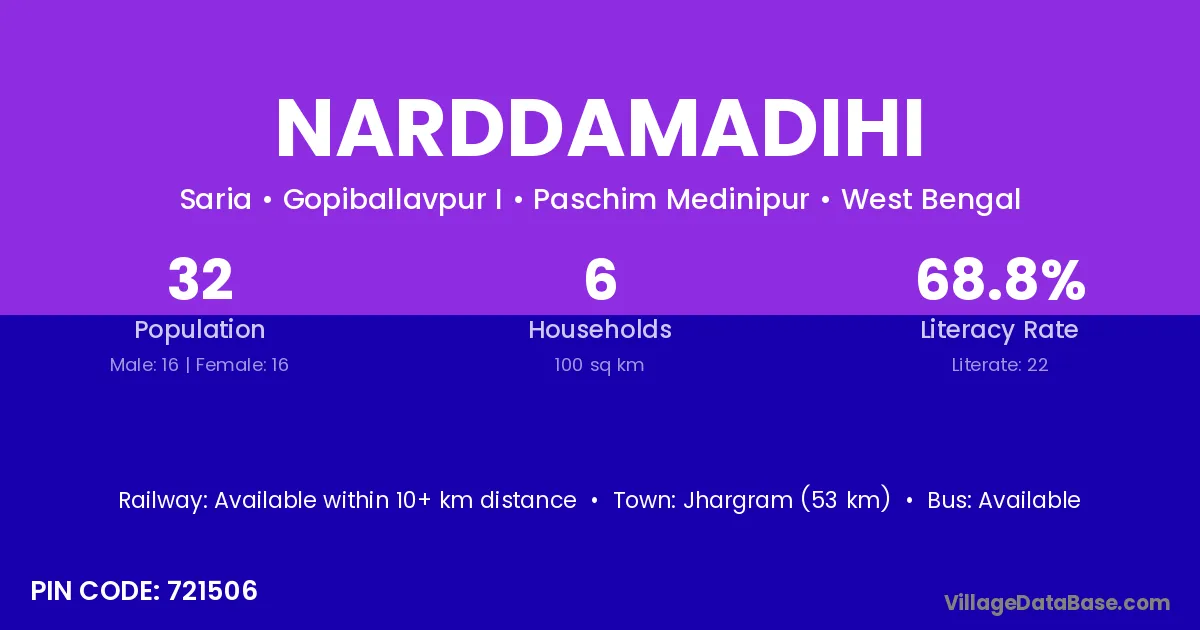 Jhargram (53 km) is the nearest town to Narddamadihi village for major economic activities and is located approximately 53 km away.