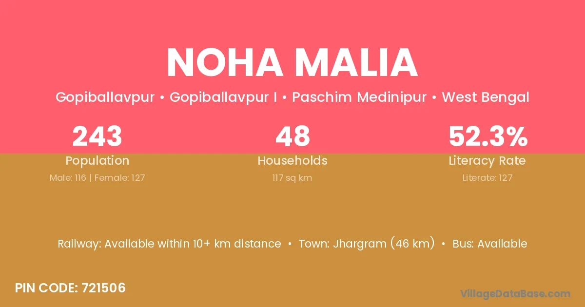 Jhargram (46 km) is the nearest town to Noha Malia village for major economic activities and is located approximately 46 km away.