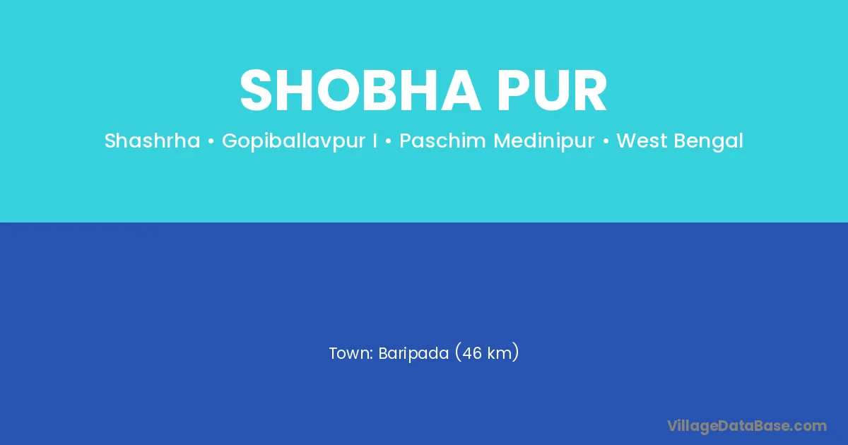 Baripada (46 km) is the nearest town to Shobha Pur village for major economic activities and is located approximately 46 km away.