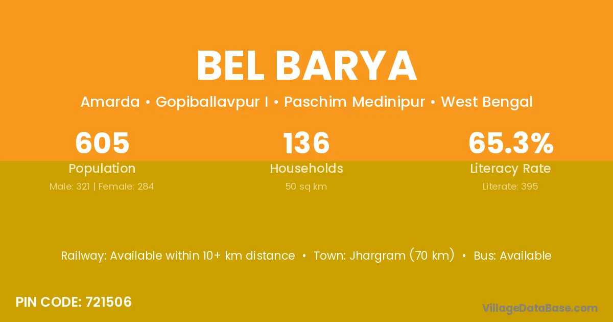 Jhargram (70 km) is the nearest town to Bel Barya village for major economic activities and is located approximately 70 km away.